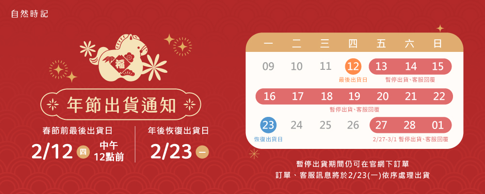 為因應2026年02月連續假期 2/13(五)-2/22(日)暫停出貨&暫停客服 2/23(一)恢復出貨 228連續假期 2/27(五)-3/1(日)暫停出貨&暫停客服 3/2(一)恢復出貨 期間官網仍可正常下訂單 暫停出貨期間訂單將於連假後依序處理出貨