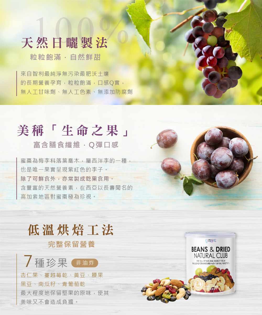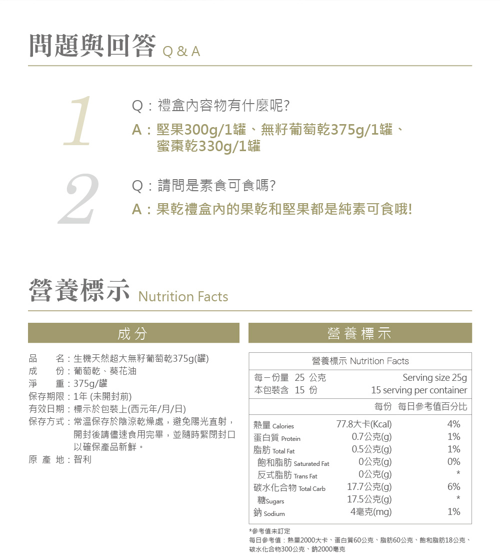 產品資訊全素│產地:無籽葡萄乾:智利、生機蜜棗乾:智利、生機綜合堅果:台灣