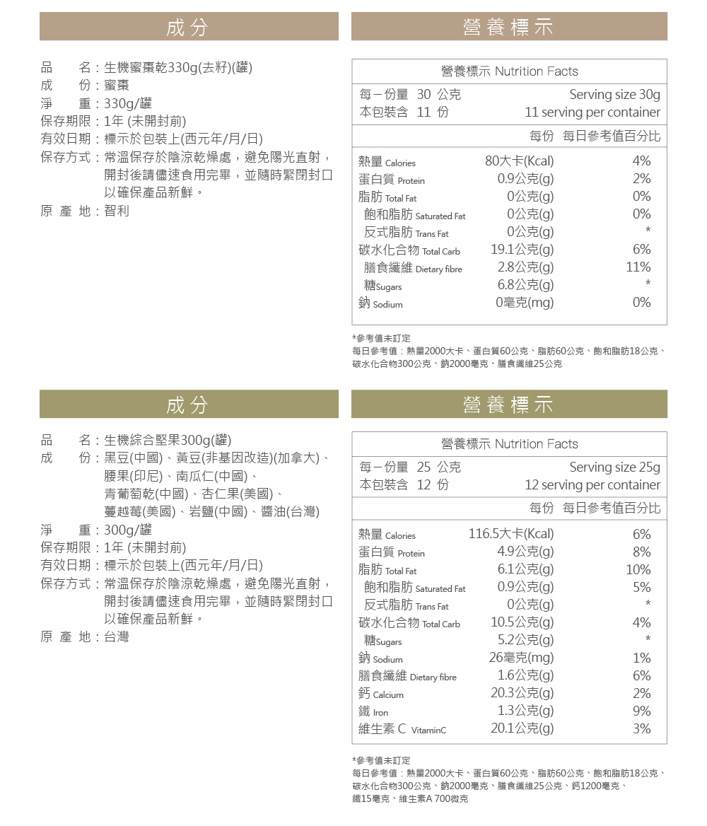 生機綜合堅果(罐)300g:黑豆(中國)、黃豆(非基因改造)(加拿大)、腰果(印尼)、南瓜仁(中國)、青葡萄乾(中國)、杏仁果(美國)、蔓越莓(美國)、岩鹽(中國)、醬油(台灣) -