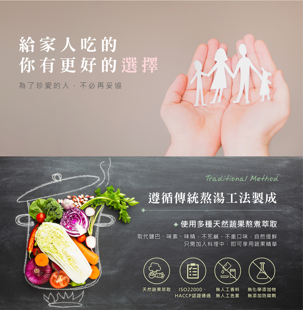 一匙鮮由多種天然蔬果熬煮製成,有別於市面上添加許多不認識的化學名稱味素、調味粉等,是料理省時調味好幫手!
