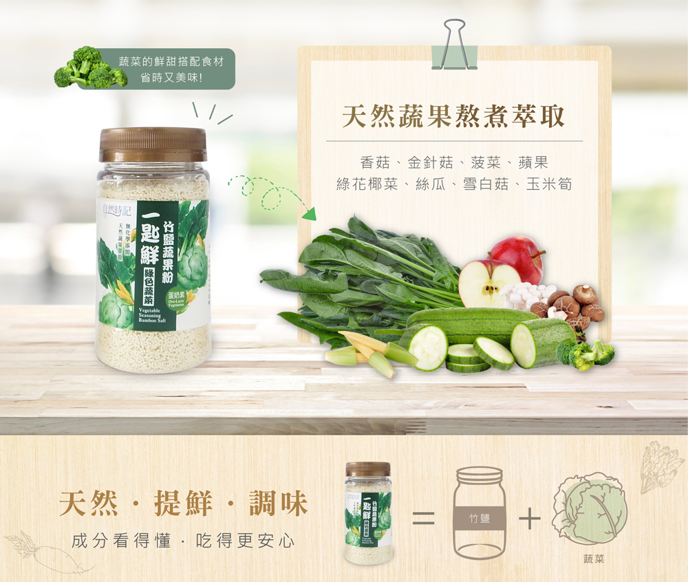 一匙鮮(綠色蔬菜)120g:乳糖、竹鹽、酵母抽出物、蔬果萃取物(香菇、金針菇、菠菜、蘋果、綠花椰菜、絲瓜、雪白菇、玉米筍)