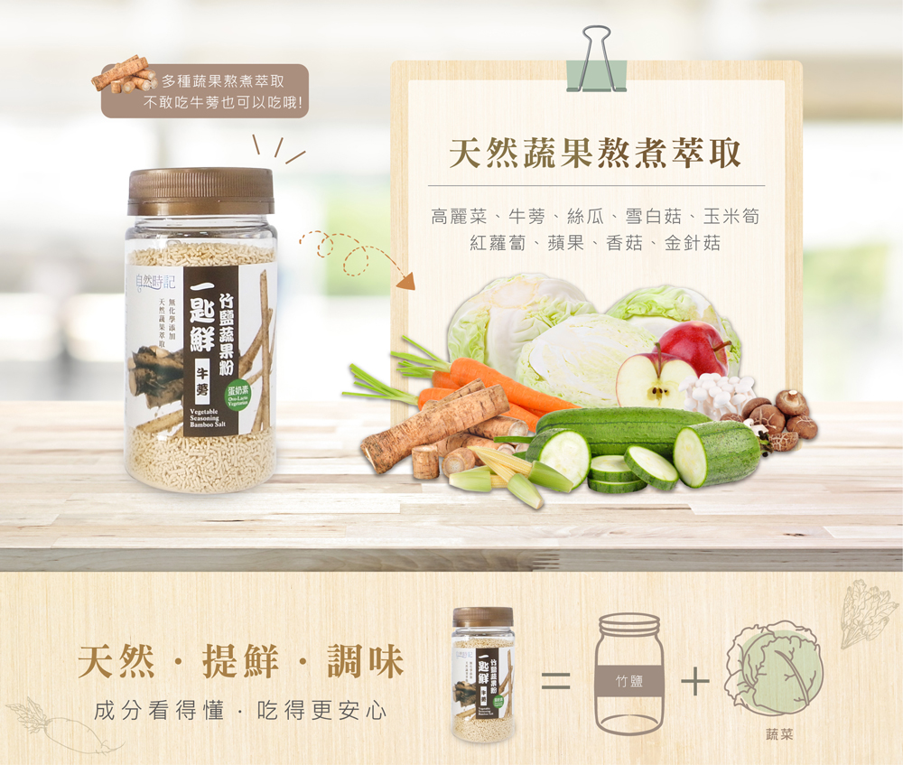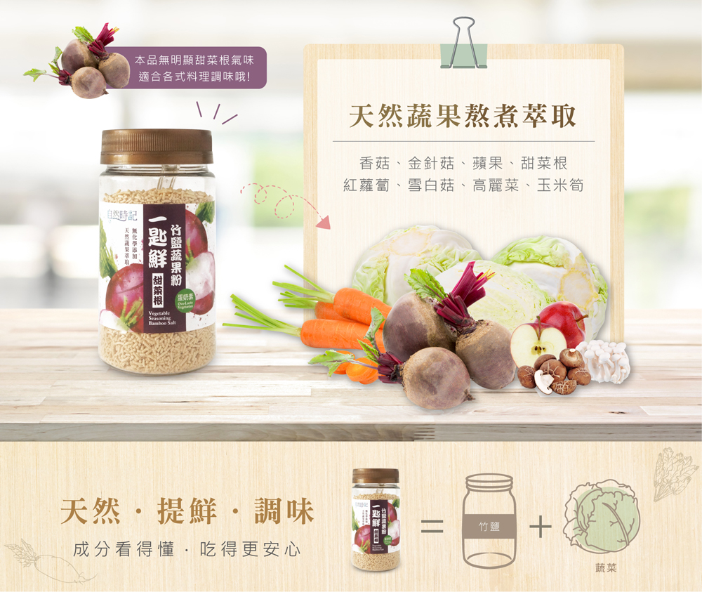 一匙鮮(甜菜根)120g:乳糖、竹鹽、酵母抽出物、蔬果萃取物(香菇、金針菇、蘋果、甜菜根、紅蘿蔔、雪白菇、高麗菜、玉米筍) -
