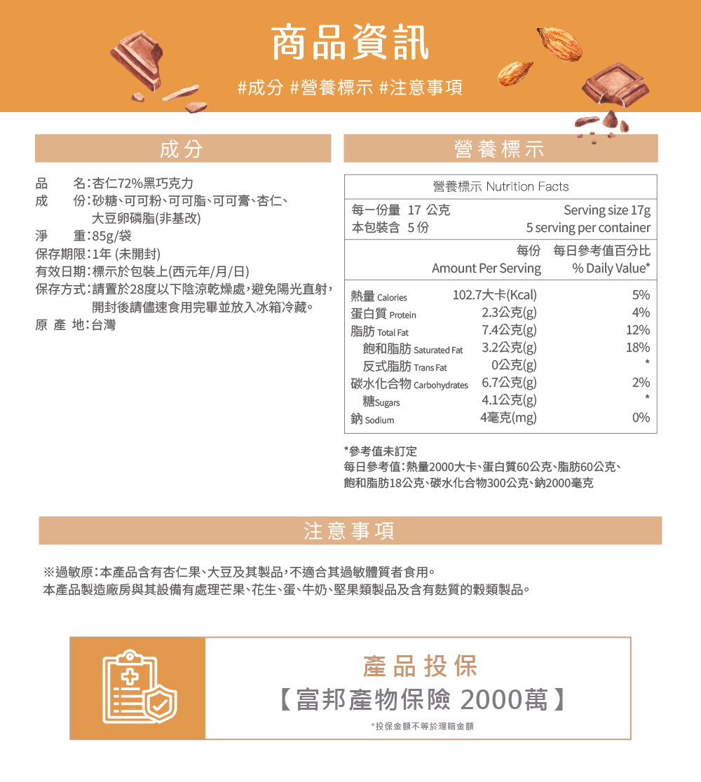 產品成分成分:砂糖、可可粉、可可脂、可可膏、杏仁、大豆卵磷脂(非基改)